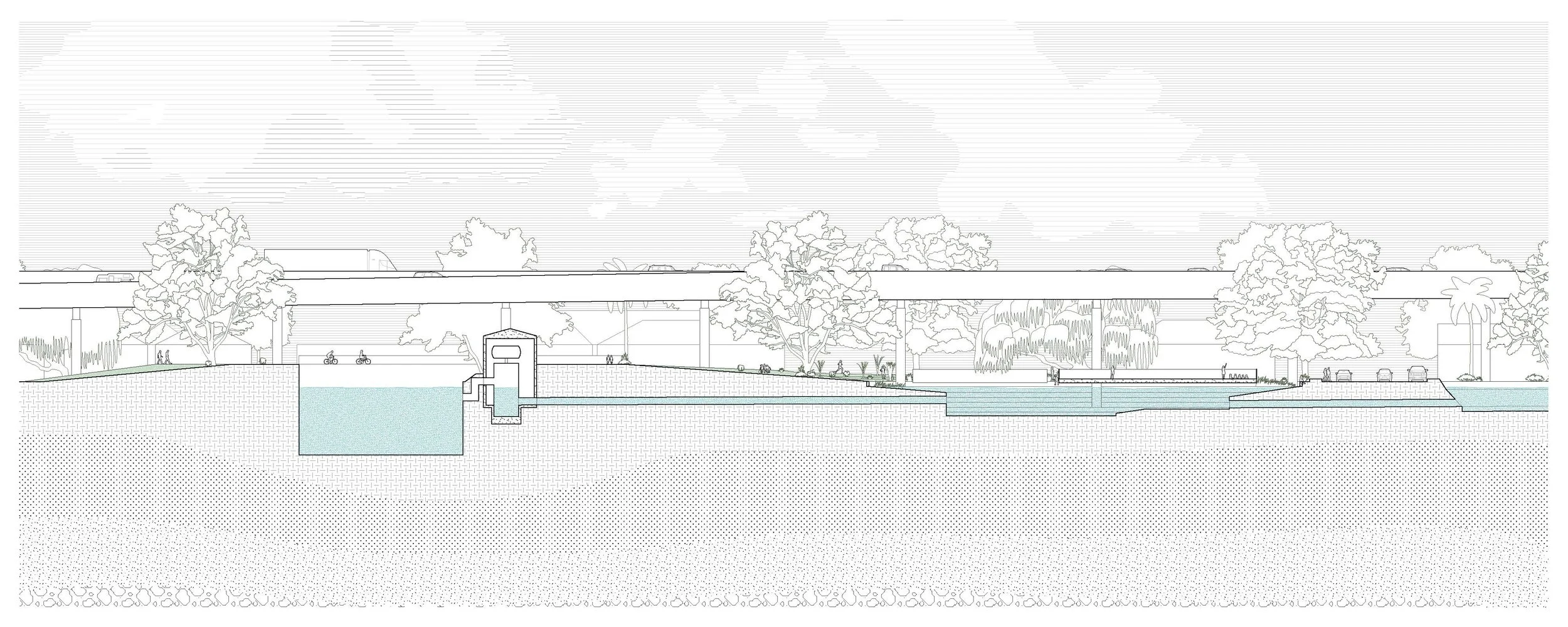 Interstate 10 and 610 are major disruptions in the urban layout of New Orleans, breaking neighborhoods, waterways, and creating negative impacts on surrounding areas. This projects aims to mediate these issues by revitalizing the area under and around the intersection of I-610 and London Ave. Canal. By adding public programming such as a community pool, farmers market, cafe, and recreation courts, neighbors are able to use this new park area properly. In addition to public programming this site also aims to offer topographic justice, by storing rainwater that enters the site and surrounding area, to allow the storm water system relief. This rain garden area supports the idea of “living with water” from the Dutch Dialogues that make water an amenity instead of something to hide behind walls. By exposing the canal, creating connection across, and adding amenities, this area can become a true park where neighbors gather, not just a piece of city infrastructure. The site becomes a public market, park, and rain garden that supports the neighborhood socially and environmentally.